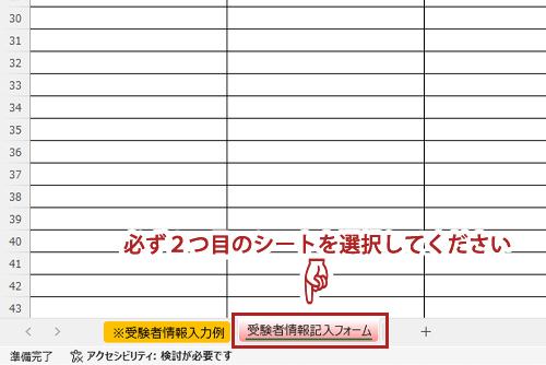 1つ目のシートに記入された入力例を参考に、必ず2つ目のシートを選択して、受験者様の情報入力をお願い致します。